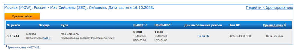 В расписании появятся вылеты по понедельникам в дополнение к уже существующим по средам и субботам. Аэробус А330-300 отправляется из Шереметьево в час ночи и прибывает на остров Маэ в 11:25 по местному времени. Полет длится 9,5 часов.