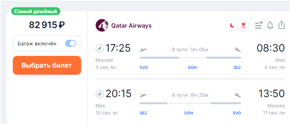 Места на рейсах катарской авиакомпании со стыковкой в Дохе предлагаются за 83 тыс. руб. Пассажиры проведут в пути туда 14 часов, обратно – 18.