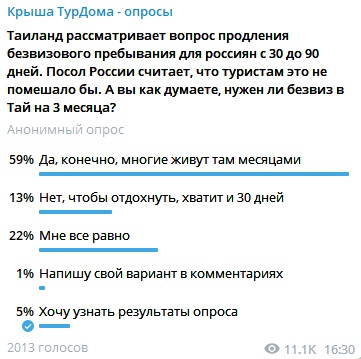 Сами туристы из России тоже не против такого решения. 59% из более 2 тыс. участников опроса телеграм-канала «Крыша ТурДома» считают, что безвиз на 3 месяца не помешал бы, ведь многие соотечественники подолгу живут в Тае. Всего 13% комментаторов высказались за то, что и 30 дней достаточно, чтобы отдохнуть.