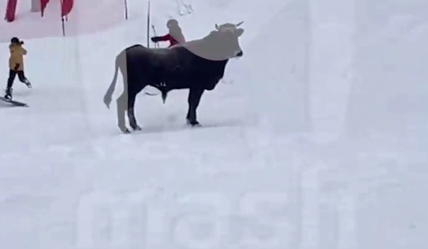 В четверг туристы на одном из спусков «Розы Хутор» встретились с неожиданным гостем – на территорию пробрался бык. Животное напугало лыжников. Инцидент удалось снять на видео.