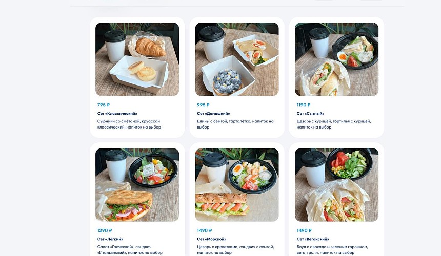 Сейчас доступно шесть сетов. Каждый состоит из двух позиций и напитка на выбор. Самый бюджетный набор – «Классический» за 795 руб. В него входят сырники со сметаной и круассан. Чуть менее 1 тыс. руб. предлагается заплатить за блины с семгой и тарталетку.