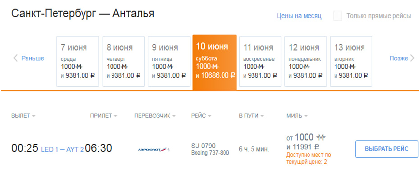 Обычная стоимость билета из Санкт-Петербурга на турецкий курорт – 46 тыс. руб. туда и обратно, оплата за провоз чемодана – еще 8 тыс. За 2 тыс. миль и 18 тыс. руб. можно забронировать места по акции. Причем у туристов из Северной столицы выбор льготных билетов больше, чем у москвичей: они доступны как минимум на вылеты с 7 по 13 июня.