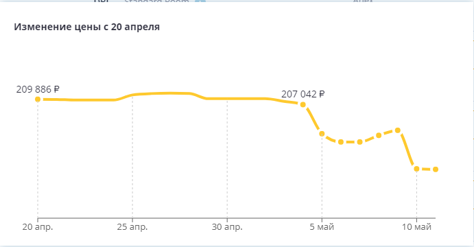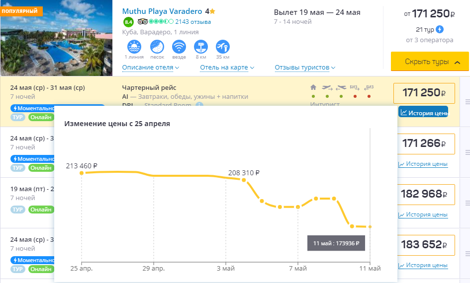 Примерно такую же динамику показывает стоимость тура «Интуриста» с размещением в Muthu Playa Varadero 4* с отправлением 19 мая. 25 апреля его можно было купить за 213 тыс. руб., сейчас – за 171 тыс.