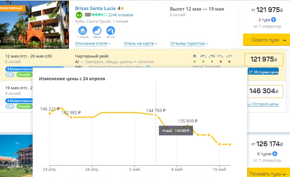 Туров за 120 тыс. уже нет, но можно найти интересные варианты с отправлением 19 мая. Минимальная стоимость тура на 10 ночей – 152 тыс. руб. на двоих. В такую сумму обойдется отдых в Azul Aparthotel 2* на Кайо-Коко с завтраками. За 162 тыс. руб. можно провести отпуск в четырехзвездочном Brisas Santa Lucia на «все включено» (Санта-Лусия), за 177 тыс. руб. – в Iberostar Selection Esmeralda 5*.