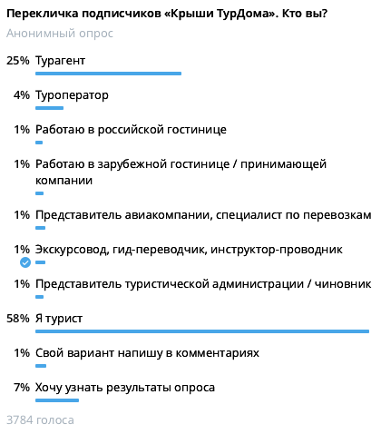 Телеграм-канал «Крыша ТурДома» предложил своим участникам написать, кто они, и проголосовать в соответствующем опросе. В течение воскресенья, 4 июня, откликнулось более 3700 пользователей. Это составляет 7% от аудитории канала (51 700), но достаточно для того, чтобы сделать некоторые выводы о ее составе.