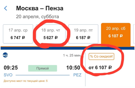 Место на рейсе из Москвы в Пензу на 20 апреля стоит 6,1 тыс. руб. якобы со скидкой, а на 18-е число его можно забронировать за 5,6 тыс. без всяких распродаж. «Какое-то недоразумение, а не акция», – заключает пассажир.