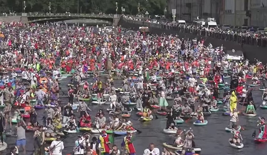 Уникальный по масштабам карнавальный заплыв на сапах состоялся в первую субботу августа в Санкт-Петербурге. Участники ежегодного фестиваля «Фонтанка SUP» прошли 9 км по каналам в центре Северной столицы.