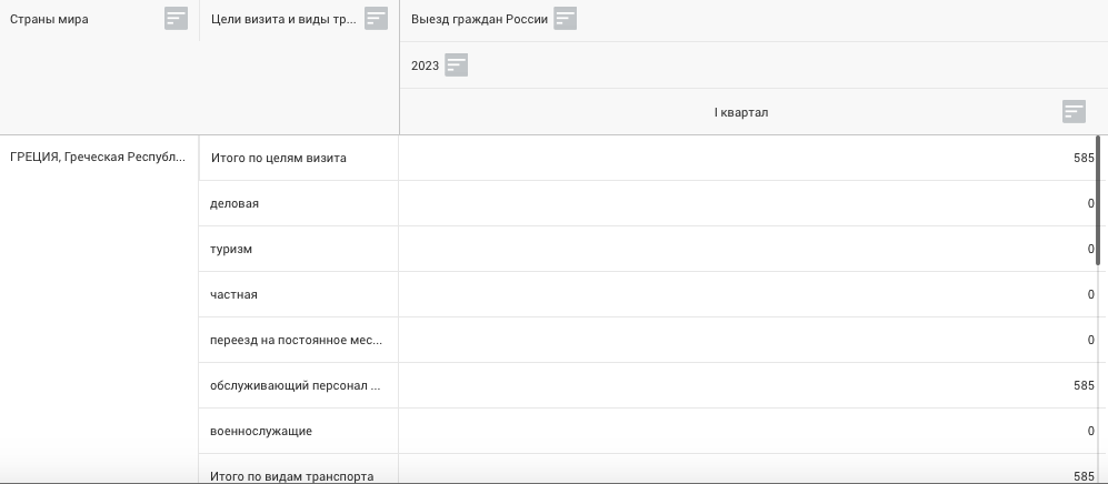 Например, если верить официальной статистике, то туристический поток в Европу сейчас равен нулю. По данным Росстата с января по март в Грецию выехал только «обслуживающий персонал» в количестве 585 человек.