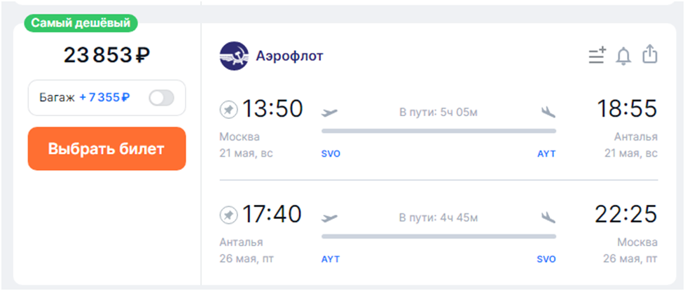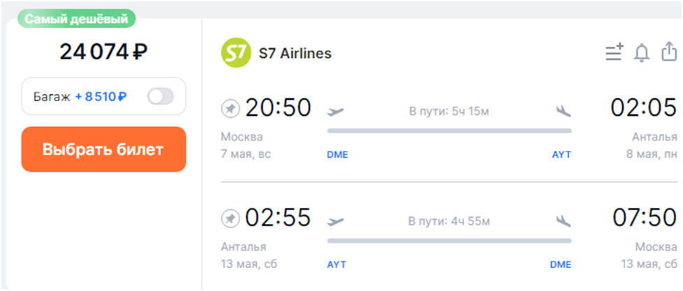 О дисбалансе спроса и предложения на линии Москва – Анталья говорят и снизившиеся цены на авиабилеты. Недорогие варианты можно найти как в конце апреля, так и в мае.
