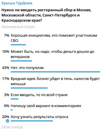 Депутаты от КПРФ предлагают ввести ресторанный сбор в размере 1% от суммы чека на нужды участников СВО в заведениях Москвы, Санкт-Петербурга, Московской области и Краснодарского края. Большинство опрошенных (43%) телеграм-каналом «Крыша ТурДома» подписчиков не поддержали идею, считая, что это популизм. «На армию сейчас и так тратят 6% ВВП», – пишут комментаторы.