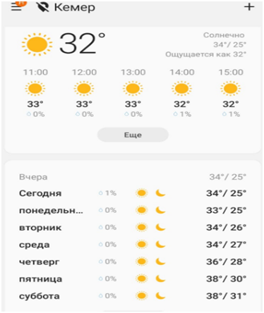 В частности, в Кемере с пятницы, 14 июля, метеорологи обещают +38 °C и без осадков. Ночью воздух будет прогреваться до +31 °C. Сегодня на курорте +34 °C, светит солнце, дождей не предвидится. Вода в море очень теплая, +28,1 °C.